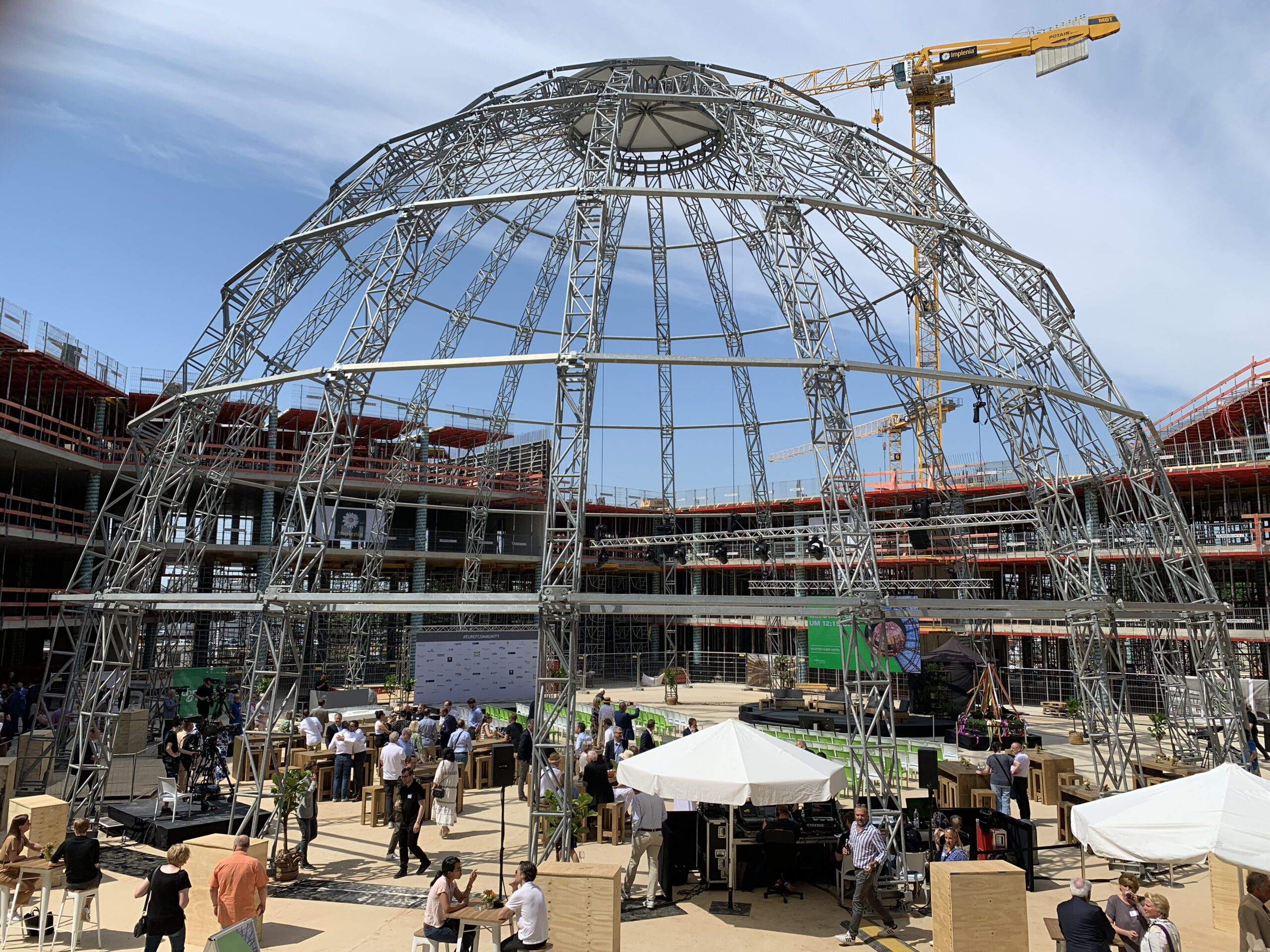 Bei schönstem Sommerwetter wurde das Richtfest für die Kuppel des neuen EUREF-Campus am Flughafen Düsseldorf gefeiert. Die Kuppel stellt eine Nachbildung der Berliner Reichstagskuppel dar und wurde ursprünglich für die Fußballweltmeisterschaft 2006 angefertigt. Nachdem sie später noch in den Berliner Gasometer integriert wurde, ist sie nun Bestandteil des Projektes EUREF-Campus Düsseldorf. Das Kuppelgerüst wiegt etwa 100 Tonnen, besitzt eine lichte Höhe von 21 m und einen Durchmesser von 32 m.
